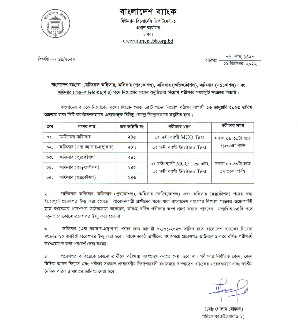 Bangladesh Bank Medical Officer, Officer (Ex cadre-library), Officer(Civil), Officer(Mechanical) & Officer(Electrical) Job Circular. BB Job Circular 2022 for Different Positions. The Recruitment Schedule of recruitment exam for the post of Medical Officer, Officer (Ex cadre-library), Officer(Civil), Officer(Mechanical) & Officer(Electrical) of Bangladesh Bank.
